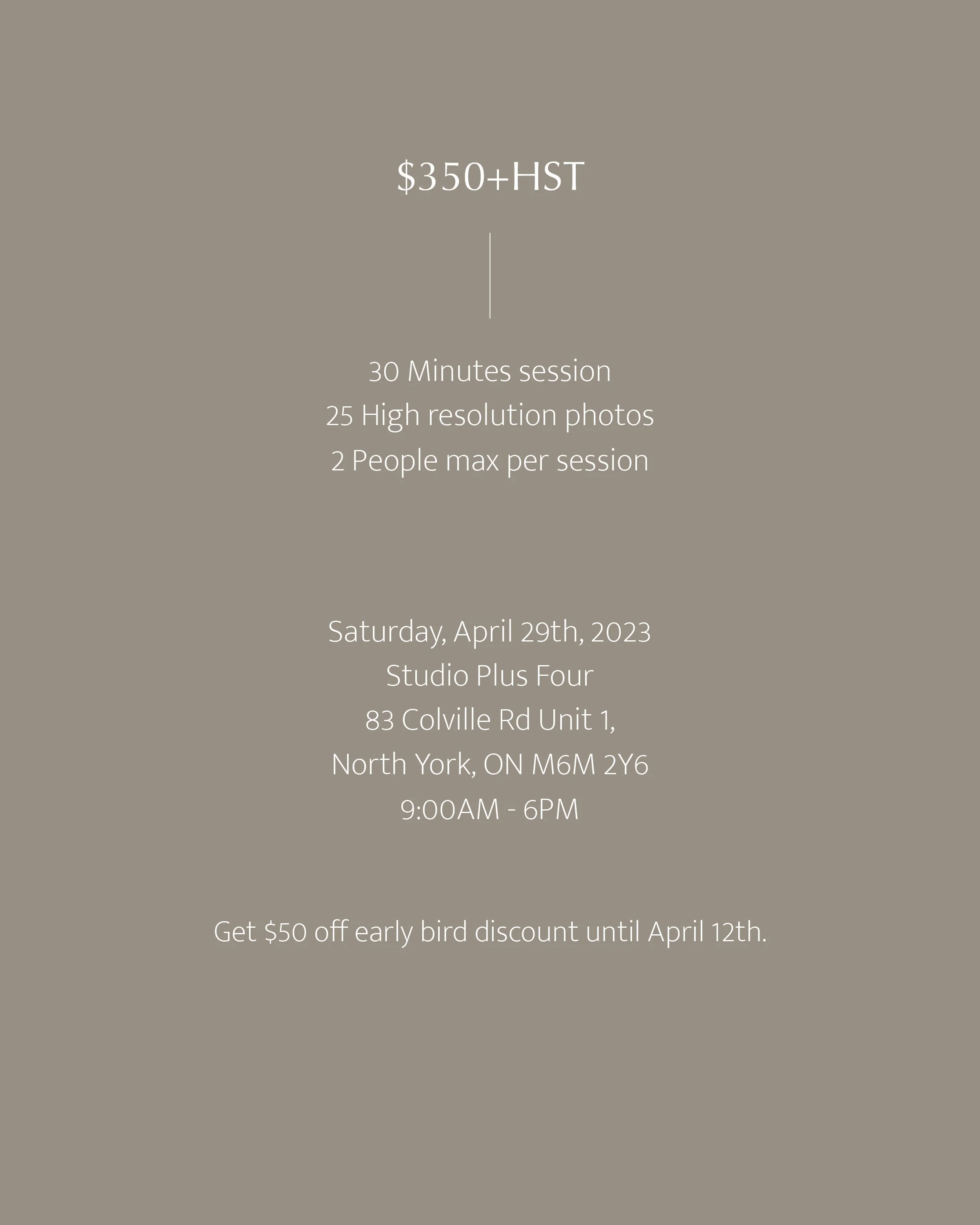 Please make sure to arrive on time to ensure we have sufficient time for the shoot. Please come dressed in the outfit(s) you plan on wearing for the shoot. This will help us get started right away and avoid any delays in the process.